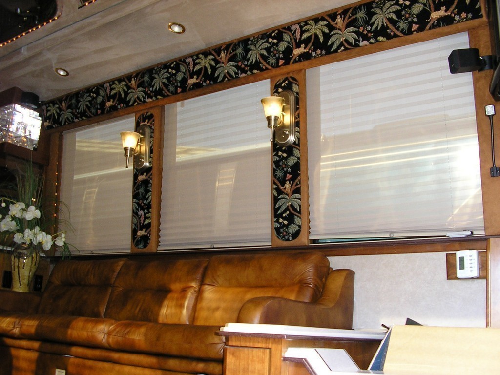 052 Prevost Motrohome Class A -Newly upholstered salon sofa, valance, and light sconces by Excalibur Coach