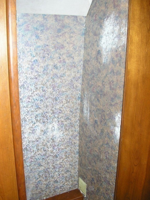 060 Prevost Motrohome Class A -Bath with old wallpaper before upgrade by Excalibur Coach