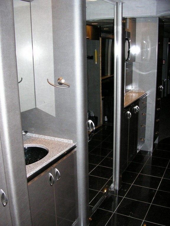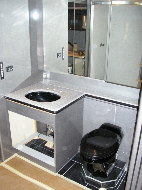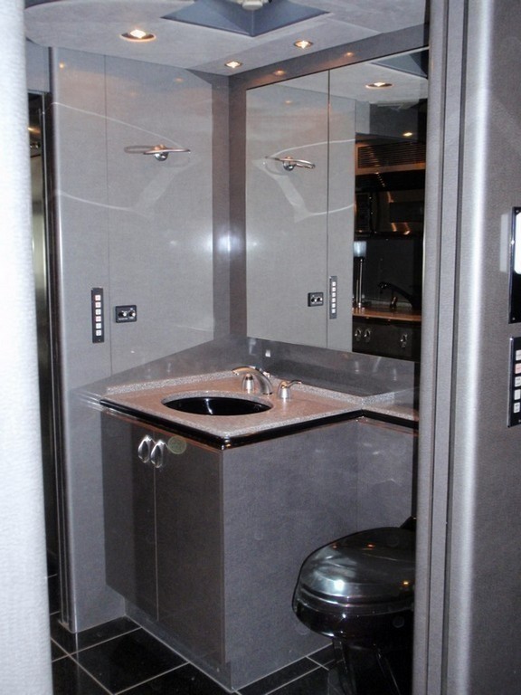 011 Prevost XL II Bathroom before Excalibur remodel by Excalibur Coach. Also Motorhome, Class A, H3-45