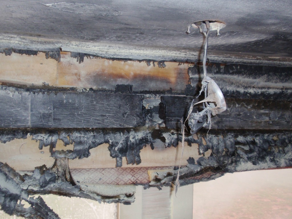 01n Prevost H3-45 ceiling above passenger seat burn job before repairs by Excalibur