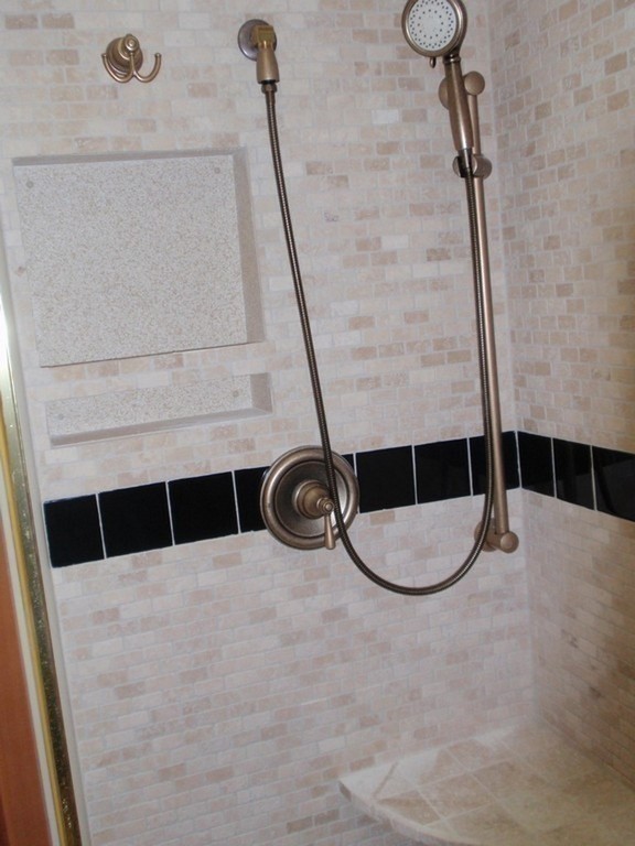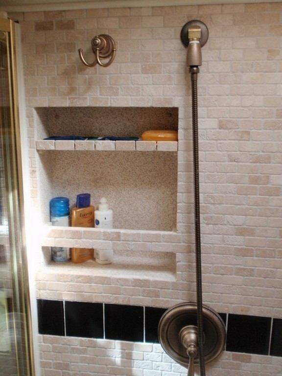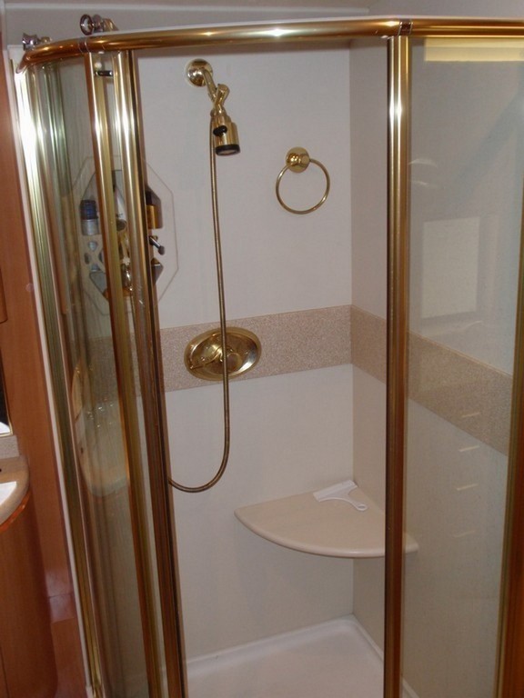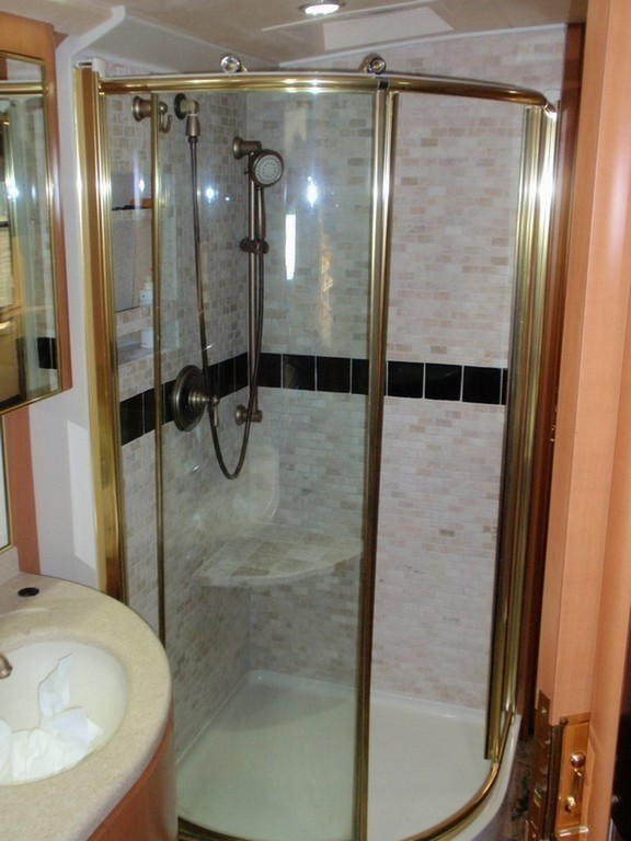 005 Prevost XL Marathon with Excalibur Coach inset shelving in newly remodeled stone shower