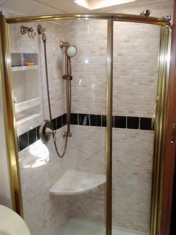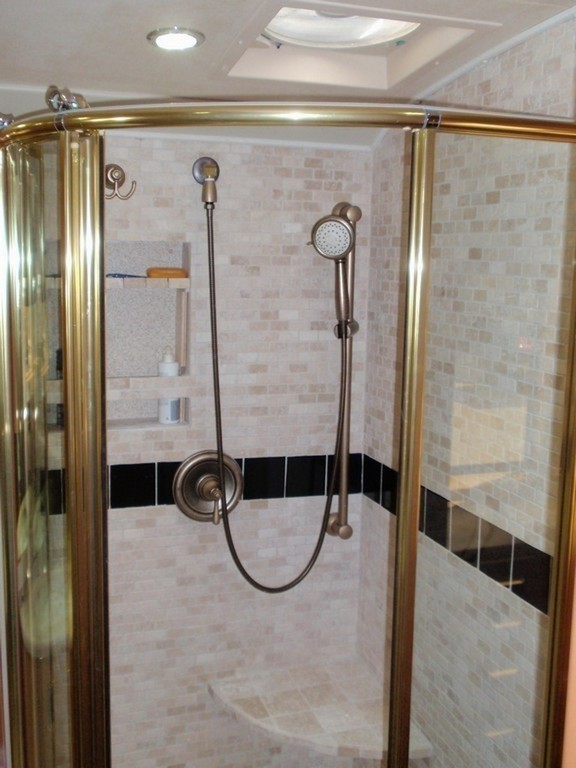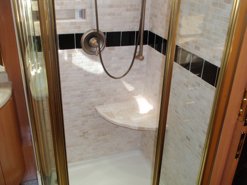 010 Prevost XL Marathon Newly upgraded stone shower with inset shelf and seat all done by Excalibur Coach